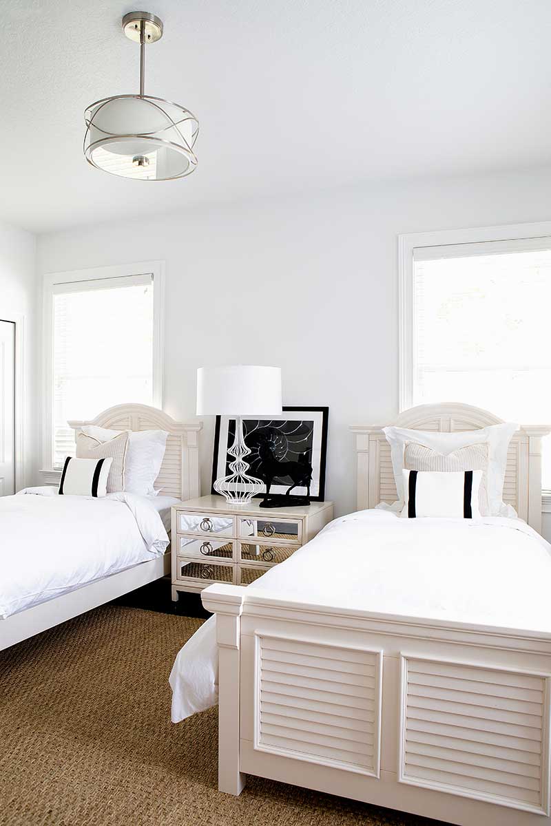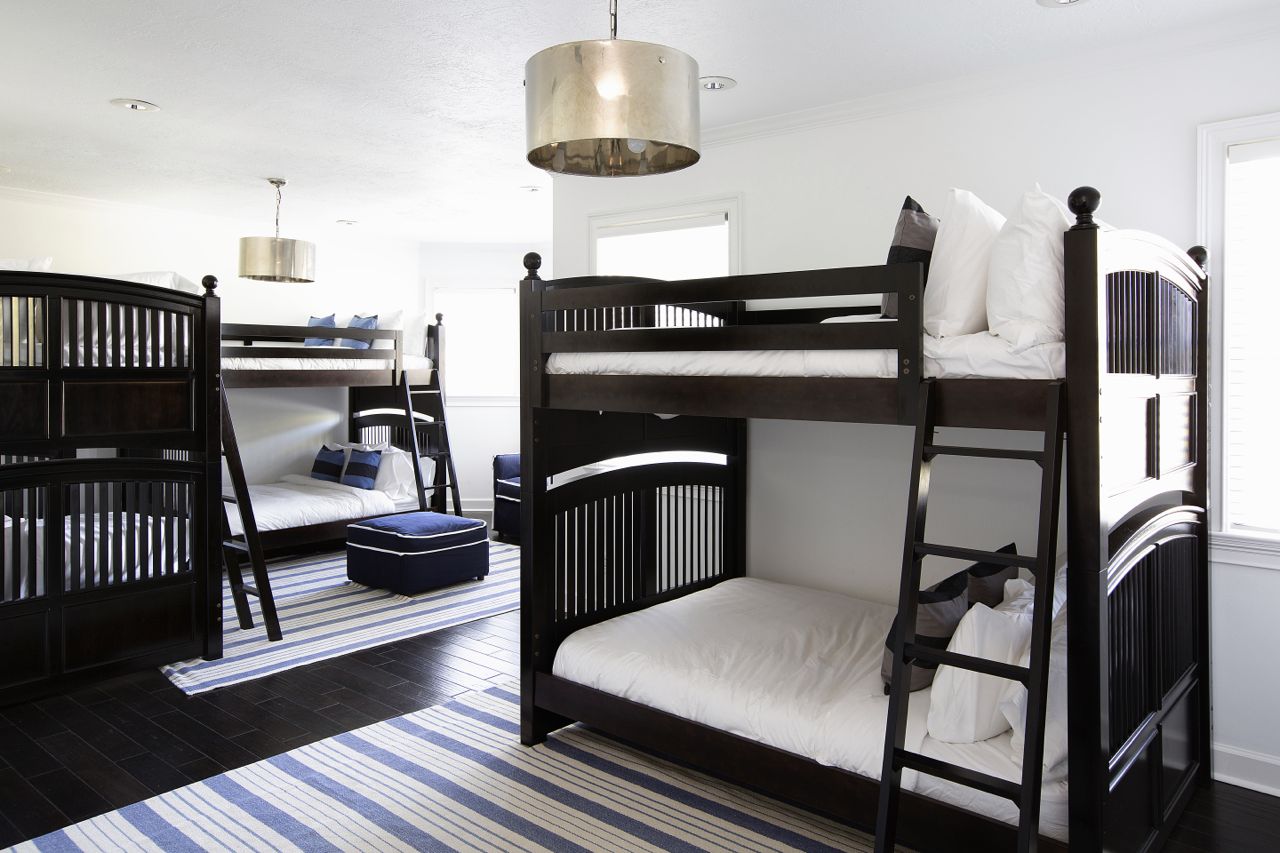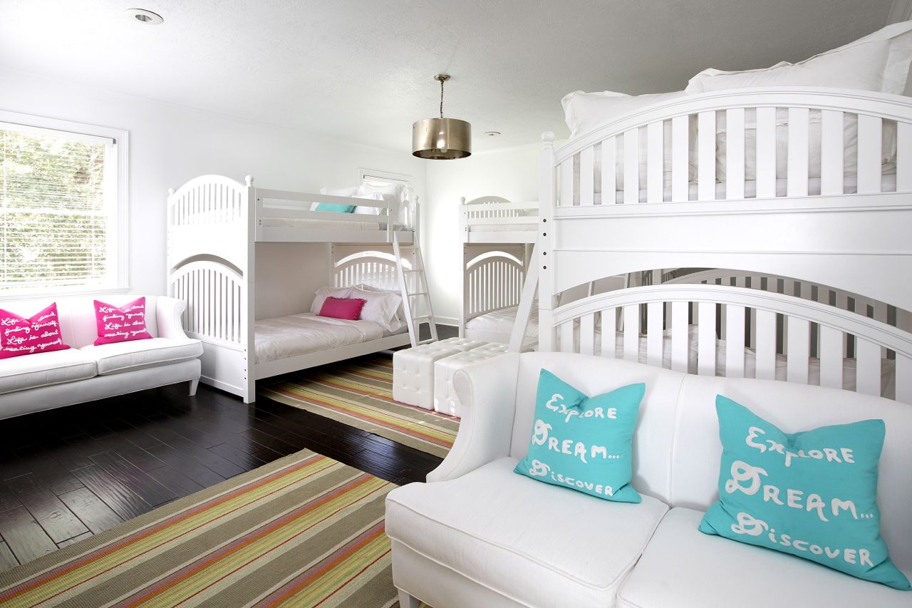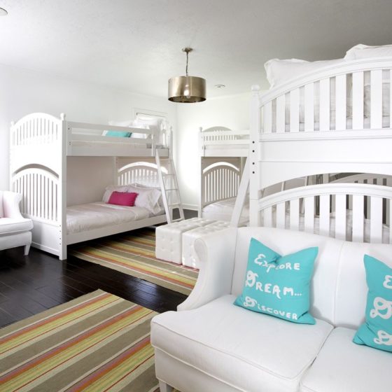 The ultimate kids sleepover rooms, each with three, full size custom bunk beds — rich mahogany and navy for the boys, dreamy ivory and pink for the girl’s — and each spacious private bath and dressing areas.